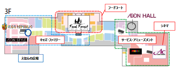 3階はキッズファミリーゾーンとサービス・アミューズメントゾーンで構成する。イオンスタイルのキッズリパブリックに隣接させて、1500坪となるエリア最大級のキッズ・ベビーゾーンをつくる。中央には、県内最大級となる約950席を備えたフードコート「Food Forest(フードフォレスト)」を展開する。地元飲食店も含めて13店舗が出店する。また、「イオンシネマ」は9スクリーン1341席の規模だ。。
