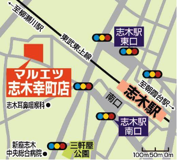 同店は、埼玉県志木市の南西側、東武鉄道東上本線「志木駅」から400mに位置する。西側には県道113号線、東側には県道40号が走り、店舗周辺はマンションと戸建住宅が混在している住宅地だ。700m圏内の人口は2万4755人、世帯数1万1969世帯。近くには、同じユナイテッド・スーパーマーケット・ホールディングスグループのカスミが運営する「フードスクエアカスミ志木店」がある。