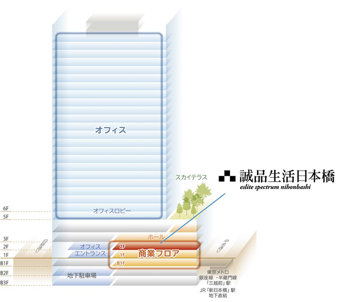 商業施設「COREDO室町テラス」は約1818坪、約30店舗のテナントの出店が予定されている。台湾や中国などで高級書店を運営する「誠品生活日本橋」がキーテナントとして入居する。日本での出店は「誠品生活日本橋」が初。運営は(株)有隣堂が手掛け、書店の枠にとらわれない文化色豊かな店舗運営を行う。