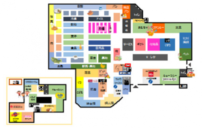 1階は直営のフロアで、食品売場と日用品・衣料品売場で構成する。店舗入口の左翼手前に衣料品売場を、その奥に食品部門を配している。右翼が靴やペット、文具、ドラッグなどの売場だ。