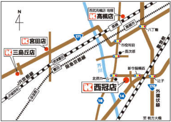 立地するのは、IR高槻駅、阪急京都線高槻駅から2.5kmほどの住宅地だ。1km圏内には世帯数1万5729世帯、3万4928人を有するが、徒歩2分の距離にコノミヤ高槻西冠店、さらにジャパン高槻下田部店があり、競争も激しい。