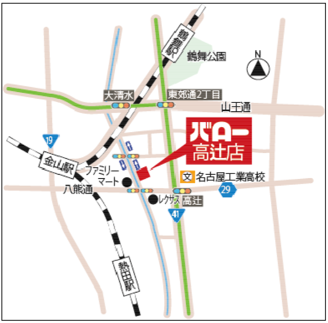 高辻店は、名古屋市昭和区の南西部に立地し、JRと名古屋鉄道、名古屋市営地下鉄が乗り入れる金山総合駅から東へ約1kmに位置する。幹線道路を挟んだ1kmほど先にイオン熱田店、2㎞周辺には、マックスバリュ千代田店、ピアゴ ラ フーズコア桜山店がある。