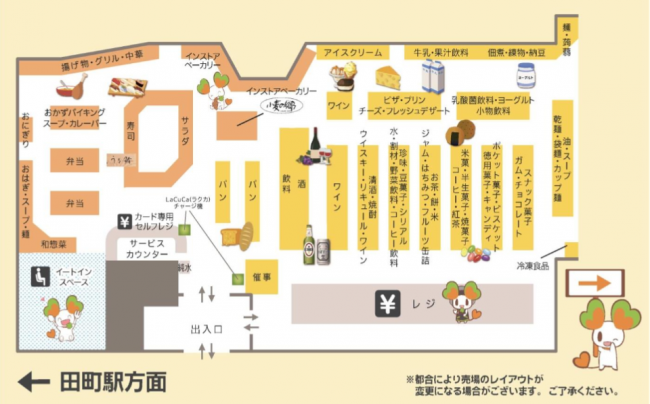 田町店の売場面積は356坪である。都心複合ビルへの出店であるため、やや小型になる。レイアウトを見てもわかるように、奥行きのある店舗で、出入り口は2カ所を設ける。