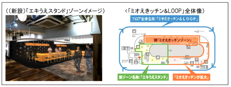 2018年3月に誕生した食ゾーン「ミオえきッチン」は拡大する。そして、新ゾーンの「エキうえスタンド」とともに、フロア全体を回遊型の空間「ミオえきッチン&LOOP」と名称も改める。新ゾーンの「エキうえスタンド」では立ち食い寿司の「牡蠣とワイン 立喰い すしまる」などを出店して、お酒も提供する。