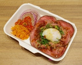 「食・楽・健康協会」が推奨する1食当たりの糖質量を「40g」に抑えた、「ロカボ生活!」の商品。セントラルキッチンで焼成したローストビーフを店内で1枚1枚スライス。半熟卵、葱をトッピングし、それぞれの素材の味わいを引き立てる醤油ベースのタレをかけた。ブロッコリーとカリフラワーをご飯と和え、副菜にはセミドライトマト、アーリーレッド、自家製のキャロットラペをトッピングした。799円(税抜き、以下同じ)。