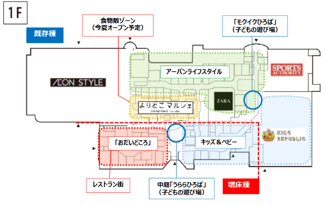② キッズ・ベビー用品を展開する大型専門店「キッズ共和国+」を、約6000㎡の「キッズリパブリック」として拡大リニューアルする。また増床棟1Fの「キッズ&ベビーゾーン」には、屋内キッズスペース「モクイクひろば」と中庭「うららひろば」を配置する。