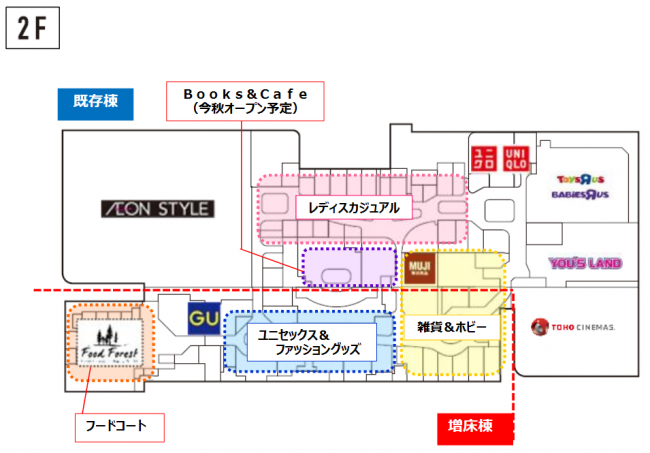 増床棟の1階には、キッズ・ベビー専門店を集積し、既存棟からレストラン街を移転する。また増床棟の2階には、三世代家族で楽しめる最新型のフードコートとして「フードフォレスト」を導入する。改装を機に、ライフスタイル雑貨専門店や大型ファッション専門店を誘致し、全体170店舗の約70%となる121店舗を刷新する。増床棟には約50店が新しく入居する。