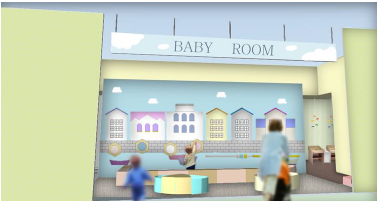 「安心してトイレトレーニングできる場所が欲しい!」という声に応えて、キッズトイレを2基新設する。オムツ替えルーム、授乳室なども設置する。また、色による授乳サポートや香りによる育児サポートも行う。さらに県内初となる親子教室 「TOEベビーパーク」を開設。