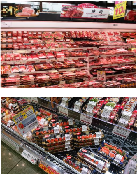 精肉部門ではA-5等級の仙台牛、マルエツオリジナル「優夢牛」や鹿児島県産黒毛和牛、鹿児島県産黒豚、「みちのく森林鶏」「はかた地どり」を扱い、「焼肉・ステーキ」「お肉屋さんのオードブル」のコーナーを展開する。