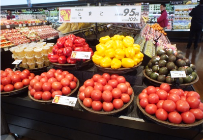 恵庭店は野菜の支持率が高い。そこで青果売場では、毎日必要な野菜10品を「安い値!」の表示を付けてお値打ち価格で提供する。また「トップバリュ 手で皮がむけるオレンジ(ダブルマーコット)」やすいか、スイーティオパイナップルなど旬の果物をカットフルーツとして販売する。