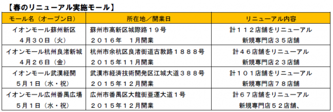 リニューアルするのは「イオンモール蘇州新区」「イオンモール杭州良渚新城」「イオンモール武漢経開」「イオンモール広州番禺広場」の4施設。