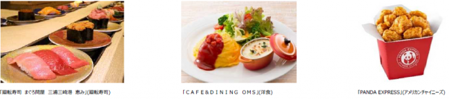 さらに、レストランストリートには「廻転寿司 まぐろ問屋 三浦三崎港 恵み」、「博多天ぷら たかお」、「CAFÉ&DINING OMS」、「PANDA EXPRESS」など沖縄初出店の店舗を含む10店舗が揃う。