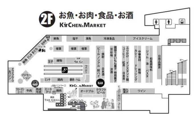 2階は「しっかり」「ゆっくり」をテーマに水産、畜産、グロサリー、リカー、アイスクリームなどを豊富に品揃えする。Kitchen&Market ゾーンにはドリンクカウンターと焼肉が楽しめるカウンターを約50 席設ける。1人でも2人でも仲間とでも、朝・昼・夜を問わず、それぞれのスタイルに合わせて楽しめるスペースを目指す。