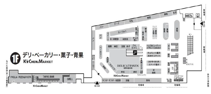 1 階は「手軽に」「さっと」をテーマに、農産、デリ・ベーカリー、デイリーフード、菓子など日常使いの商品を揃える。また通りに面して、約108席のKitchen&Marketゾーンを設ける。これは南欧(スペイン)のバルをイメージしたイートインコーナーで、簡単な食事、スイーツ、お酒のおつまみなどを提供する。