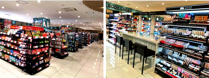 化粧品コーナーには美容食品やサプリメントなど関連商品を配置する。女性客をターゲットとして、メイクのテイスティングカウンターを設置した。