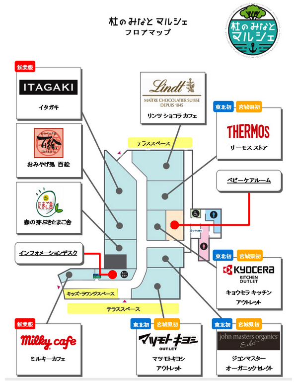 仙台市で明治30年創業の青果物専門店いたがきが、フルーツジェラートショップ&ジューススタンドの「ITAGAKI」を出店する。プレミアムチョコレートブランド「リンツ ショコラ カフェ」のほか、「ミルキーカフェ」「 みやげ処 百絵」「森の芽ぶきたまご舎」といった食の専門店を揃える。さらにアウトレットとして東北初出店のオーガニックコスメブランド「ジョンマスターオーガニックセレクト」や、「キョウセラ キッチン アウトレット」「サーモス ストア」「 マツモトキヨシ アウトレット」でマルシェゾーンを構成する。