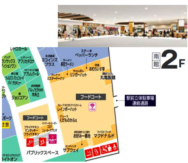 南館2階は、フードコートの座席をこれまでの850席に150席追加して、熊本最大級1000席に拡大する。「ケンタッキー・フライド・チキン」「エルクニューヨークブランチ」の新規2店舗を含む13店舗を揃える。ファミリー席、おひとり席と、さまざまなニーズに対応する座席を配置している。