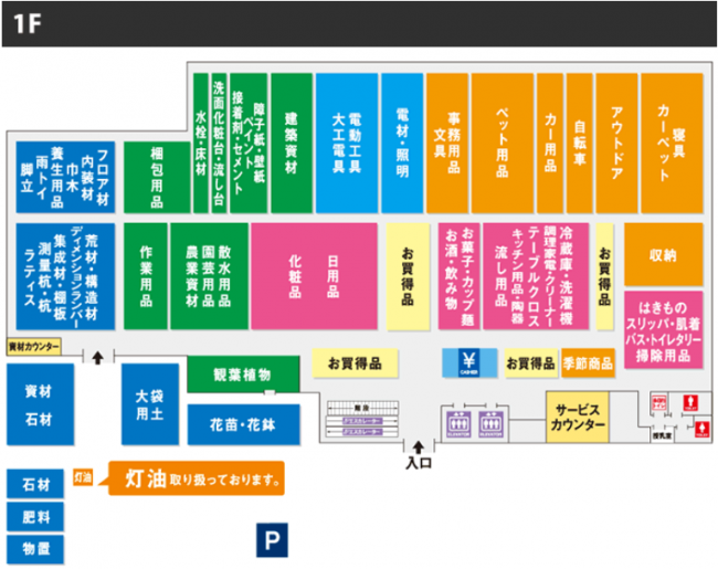 1階はホームセンターで、DIY用品、建築資材、日用品、化粧品、ペット用品などの売場で構成する。