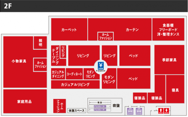 2階が家具とホームファッションの売場で、ベッドやリビング家具、照明、カーペット、カーテン、寝具、家庭用品などを揃える。