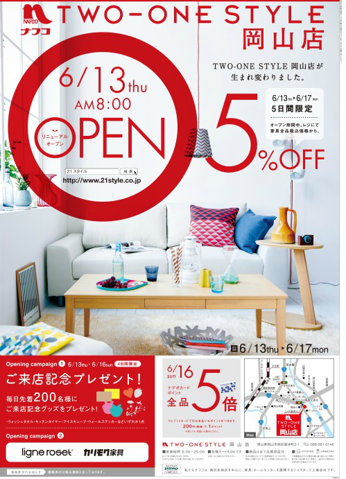 ホームセンターの(株)ナフコ(福岡県北九州市、石田卓巳社長)は6月13日(木)、岡山市南区富浜町の「ホームプラザナフコ岡山店」を改装して「ナフコ TWO-ONE STYLE 岡山店」としてオープンする。「TWO-ONE STYLE」はホームセンターに、家具とホームファッション加えたコンビネーションストアだ。