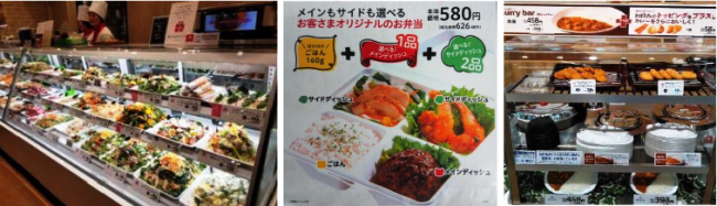 駅直結の2階入口側には、惣菜・飲料などの物販と飲食店、イートインスペースを兼ね備えた「ここdeデリ」を設置する。平日のランチや仕事帰りの夕食、休日は家族のくつろぎ場所としての利用を促す。食品売場は、夕食の一品となる惣菜を充実させるほか、メインディッシュのハンバーグや、サラダなど和洋中惣菜40種類を揃える「リワードキッチン」を展開する。
