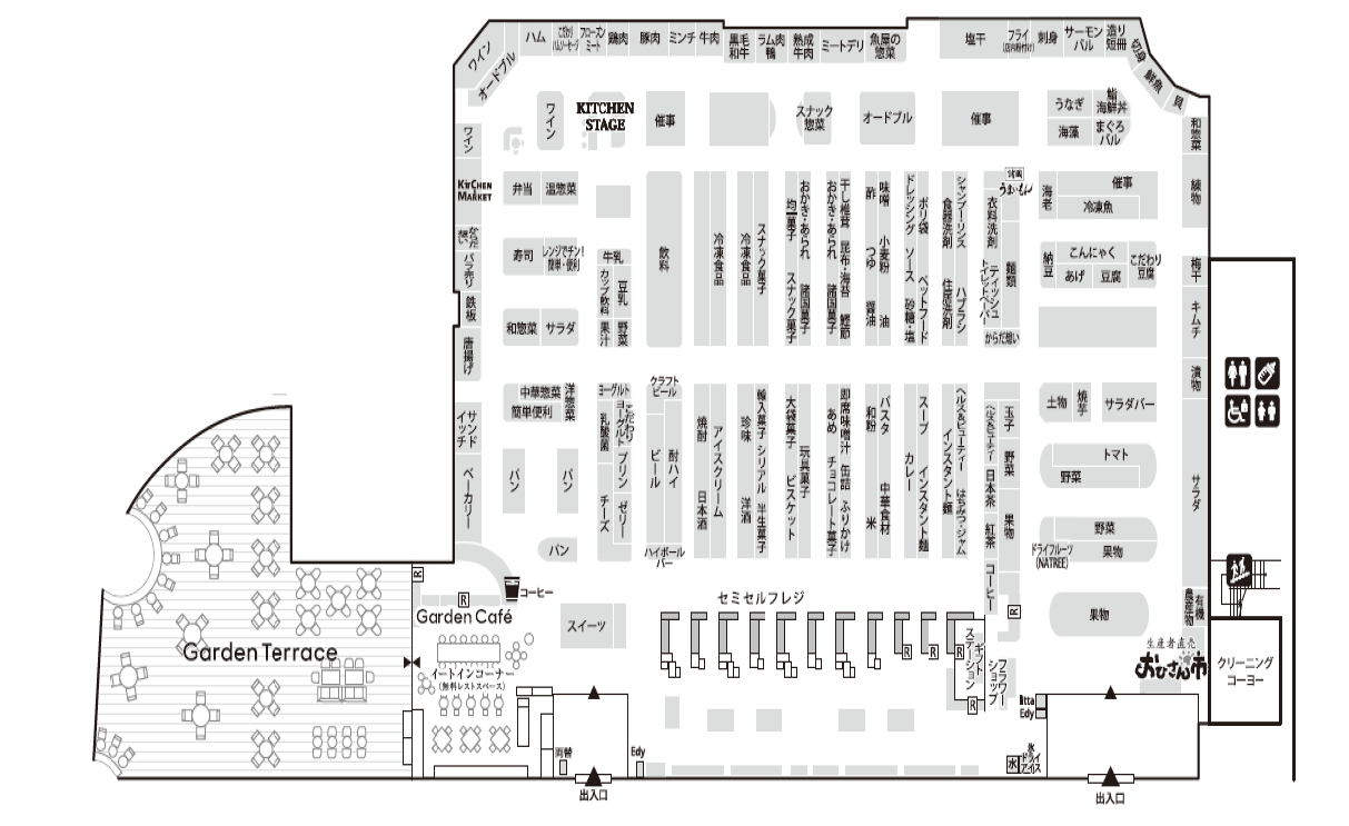 こうした商圏特性から、阪急オアシスキセラ店は「ゆっくり選べる」「過ごす・楽しむ」「賢くお買物できる」をコンセプトに、広域からの集客を図る。「アクティブシニア層」にはこだわりや健康、少量軸での提案を、30歳代~40歳代の「子育てファミリー層」にはお買い得感・健康軸での提案をテーマに、630坪店舗に最新MDを投入する。また施設内を流れる小川に沿って「ガーデンテラス」を設けて、BBQセットの貸出しも行う。さらに併設する「ガーデンカフェ」では、カフェメニューに加え、朝食メニューを展開して、「食べる・集まる・過ごせる」環境づくりを目指す。