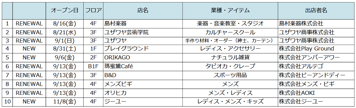 浦和駅エリアは20~30代の新たな客層の流入が増えている。そこでジーユーなど新規オープン3店・増床リニューアル7店の計10店舗を8月16日(金)から11月8日(金)までに、 順次オープンさせる。