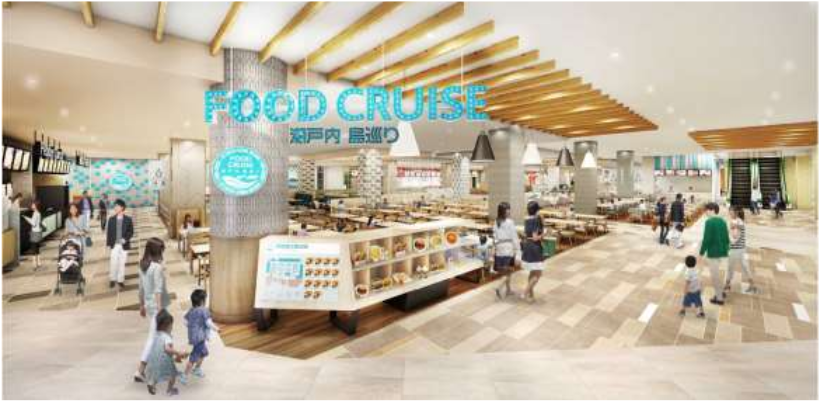 東館2 階に開設される四国最大級のフードコート「FOOD CRUISE 瀬戸内島巡り」は、席数が570 席から940 席に、店舗数も10 店舗から14 店舗に増やす。さらにイートインコーナー30席を新設し、レストスペースも2カ所増設するなど、滞在型の機能を強化する。