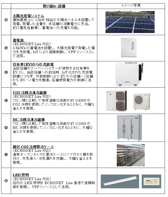 2つ目は、IoT化された遠隔制御が可能な「蓄電池」や「LED照明」「空調機」「(電気自動車)専用充放電器」などを導入する。自動で節電制御することで、店舗消費電力の外部制御を可能にした。
