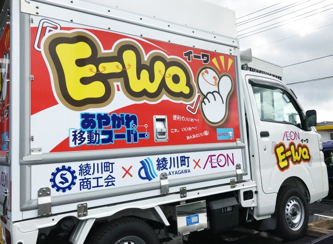 移動販売車「E-Wa」の名前は、イオンの「イ」、綾川町と綾川町商工会、二社からのダブルの輪「ワ」から生まれた名前で、「便利でいいわ~!」「これ、いいわ~!」「みんなといい輪~!」をキャッチフレーズに、笑顔が集うひと時をイメージしてできたロゴマークとなっている。