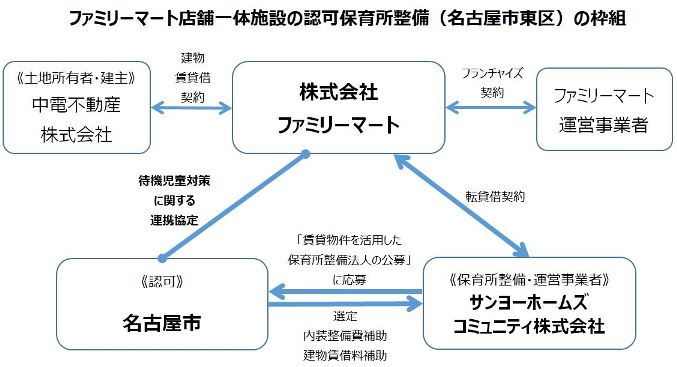 中電不動産(株)(地所有者・建主)が保育所・店舗一体施設の建物を新築して、ファミリーマートが建物全部を賃借し、保育所部分を転貸する。さらにサンヨーホームズコミュニティ(株)が保育所部分を賃借し、保育事業者として運営する。
