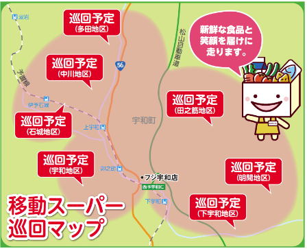 巡回地区は西予市宇和町の宇和、石城(いわき)、中川、多田、田之筋(たのすじ)、明間(あかんま)、下宇和(しもうわ)地区。