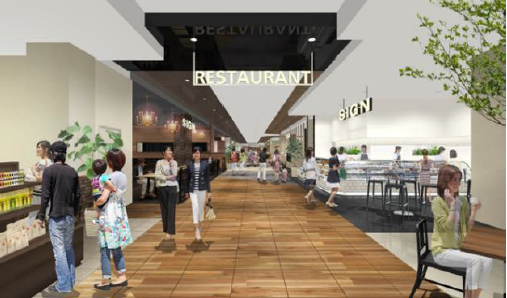 レストラン&カフェ11店舗、フードコート9店舗、食物販9店舗からなる市内最大規模のグルメゾーンが誕生する。1Fには明るく開放的なカフェやレストラン、人気の食物販エリアを、2Fには子ども連れに嬉しい小上がりを配置した約700席のフードコートを設ける。