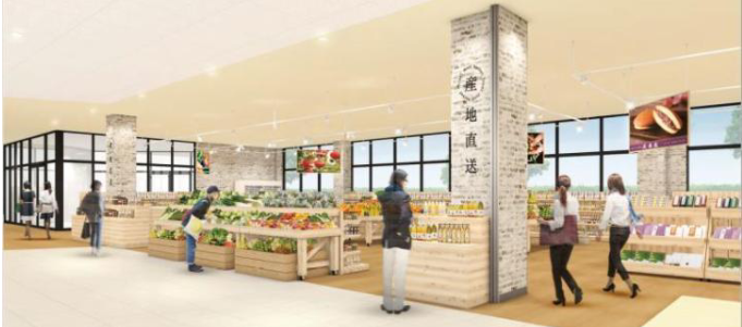 地産地消では、地域生産者と連携し、岩手で採れたネギやほうれん草、ブロッコリーなどの旬野菜、果物や切花、特別栽培米の江刺金札米「ひとめぼれ」を製粉した米粉を原料とする手づくりパンなどを提供する。鮮魚では地元の大船渡漁港で水揚げされ、直送便で届く「地獲れ鮮魚」や、奥州市前沢で肥育された三大和牛の一つ「前沢牛」を展開していく。