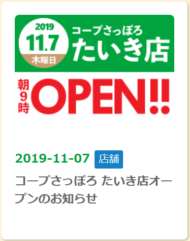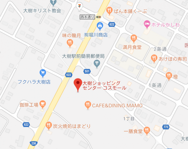 また、コープさっぽろでは、11月7日(木)に、「コープさっぽろたいき店」をオープンする。道の駅コスモール大樹に併設するショッピングセンターにあった総合食料品店「コスモフード大樹店」を譲り受けて出店する。同ショッピングセンターと道を挟んでアークスグループの(株)福原が経営する「フクハラ大樹店」がある。