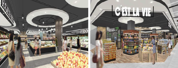 1階の生鮮部門では産地直送の安全・安心で新鮮な旬の商材を、国内はもとより、世界各地から豊富に取り寄せる。また、店内で加工されたRTC(レディートゥークック)商品コーナー、カットフルーツコーナー、チーズコーナーをはじめ、お客が選んだ食材でシェフがその場で調理する「Cook You Eat(クックユーイート)」コーナーなどを設ける。