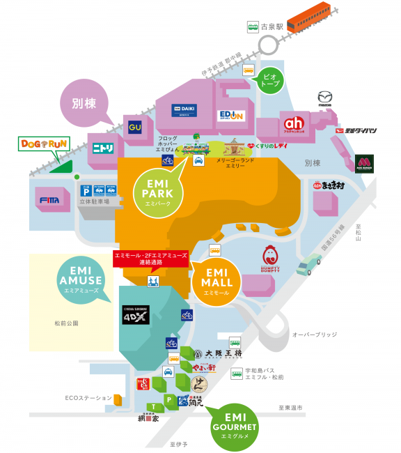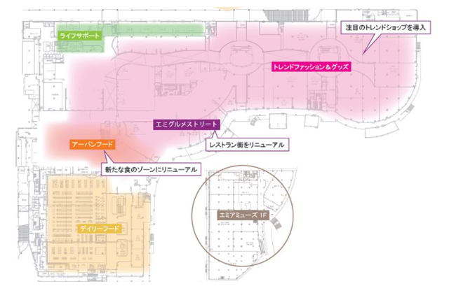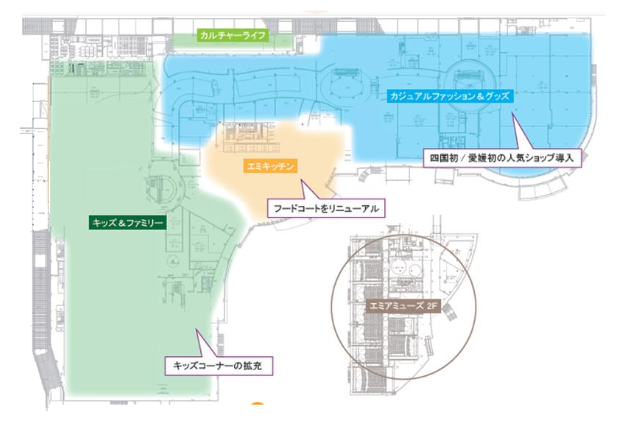 とくにモール棟2階のキッズ・ファミリーゾーンには赤ちゃんルームを新設し、エミキッチンと呼ばれるフードコートには、ベビースペースやキッズテラスを設けるなど、ファミリー向けの施設を強化する。またエミアミューズ別館を建設して、四国最大級の体験型大型エンターテインメントを展開する計画だ。