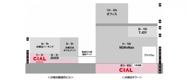 CIAL横浜は、1962年に誕生し、横浜駅商業施設の再開発に伴い2011年に閉店していた。入居するJR横浜タワーは地上26階、地下3階のオフィス・商業の複合ビル。12階以上がオフィス、8階~10階がシネマのT・ジョイ、1階~10階が(株)ルミネが運営するNEWoMan横浜で構成される。そして地下1階~3階にCIAL横浜が入る。