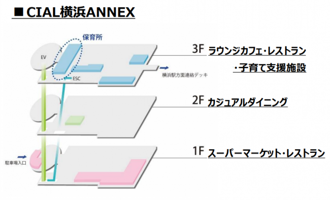 一方、「CIAL横浜ANNEX」は、9階建てのJR横浜鶴屋町ビルの1階~3階に入居する。同ビルにはほかに、西口最大級の駐車場・駐輪場、ホテル、保育所、フィットネス・スパが開設される。CIAL横浜ANNEXにはスーパーマーケットの文化堂、レストランなど6テナントが入る。