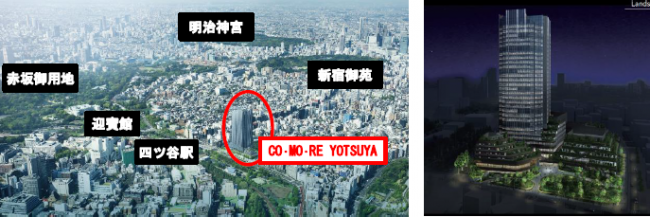 「CO・MO・RE YOTSUYA」は、①オフィス棟「YOTSUYA TOWER」、②商業ゾーン「CO・MO・RE Mall」、③住宅「ザ・レジデンス四谷アベニュー」「ザ・レジデンス四谷ガーデン」、④教育施設「四谷グローバル スタディスクエア」、⑤公益施設「四谷スポーツスクエア」「四谷クルーセ」など、多機能施設を整備する。