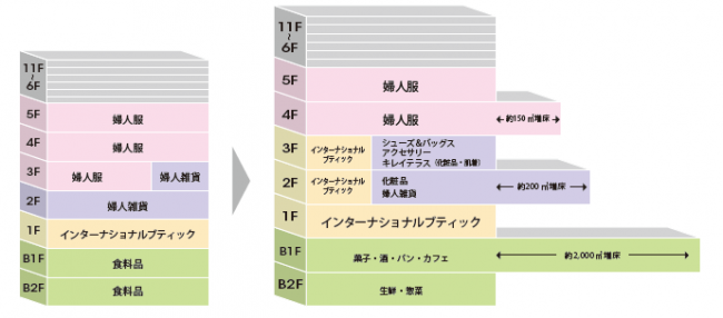 2~5階の婦人ファッションフロアのリニューアルでは、商品カテゴリーごとの面積を大きく変更し、「インターナショナルブティック」や「化粧品」売場の面積を拡充した。