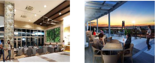 2階通路のカーペットを張り替え、椅子・ソファを新たに導入する。子どもの遊び場は「海」を、中央はテラスから望む「夕陽」を、総合スーパーのイオン方面は「森」をイメージしてデザインされた。また、1階に設置されている椅子も全体的に明るいものに入れ替えられた。
