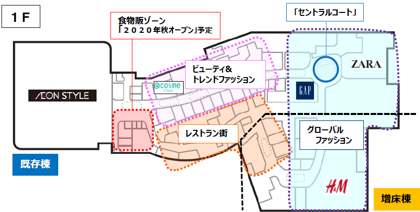 既存棟から増床棟につながる1階部分では、グローバルファッションゾーンを展開する。スウェーデン発のファストファッション「H&M」が約727坪の広さで県初内出店するほか、既存棟1階にはスペイン発の「ZARA」、アメリカ発の「GAP」が出店する。