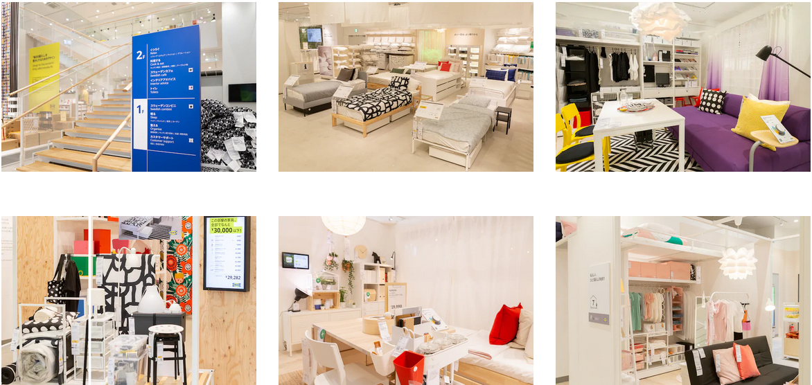 売場は「眠る」「整える」「くつろぐ」「料理する」という4つの「暮らしのニーズ」で構成する。イケアの特徴であるルームセットは、都市の限られたスペースに合わせて、レイアウトやサイズといったスペースの有効活用を提案する。たとえば一人暮らし向けの部屋、低価格で実現する部屋など、都市部の暮らしを反映したルームセットでプレゼンテーションする。