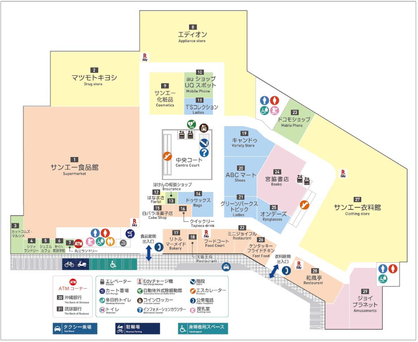 物販はサンエー直営店舗である「衣料館」「化粧品」「食品館」と、サンエーが沖縄でエリアフランチャイジーとなっている家電の「エディオン」、ドラッグストアの「マツモトキヨシ」で衣・食・住のニーズに応える。また外食の直営店舗は自社チェーンの「和風亭」やエリアフランチャイジーの「ミニジョイフル」「大阪王将」「リトルマーメイド」を揃える。