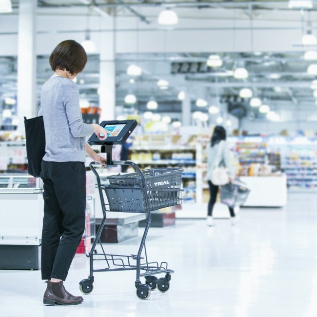 スマートストアの特徴の一つは決済の仕組みだ。お客はタブレット端末が付属された「スマートショッピングカート」を使い、購入したい商品をバーコードでスキャンする。会計は、通常のレジを通らず、ボタン一つで済ませることができる。スマートショッピングには事前にトライアル独自の電子マネーの登録が必要になる。お客にとってはレジ待ち時間が解消する。店舗ではレジスタッフの人手不足の解消になる。