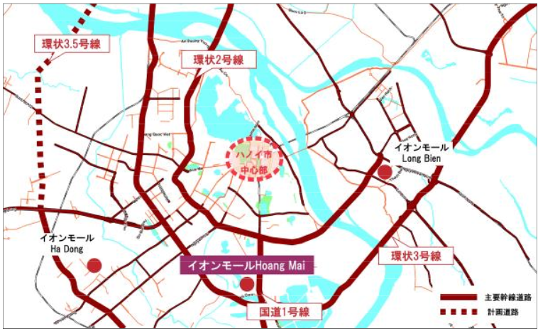 計画地のハノイ市Hoang Mai区は、ハノイ市中心部から南へ約6kmに位置し、ハノイ中心部への入口として国道1号線が縦断、また、鉄道駅や郊外都市へ向かうバスターミナル、タクシー乗降場などを集約した交通ターミナルを有するなど、アクセス環境に優れている。さらに、将来は地下鉄メトロ1号線も計画されるなど、駅前周辺開発が急速に進んでいる。