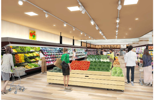 改装では関西スーパーが核コーナーとして新店や改装店で導入を進めている「デリカステーション」、食の情報発信の場となる「キッチンスマイル」、野菜たっぷりで健康をサポートする「サラダステーション」、季節の花の「フラワーガーデン」などを設ける。