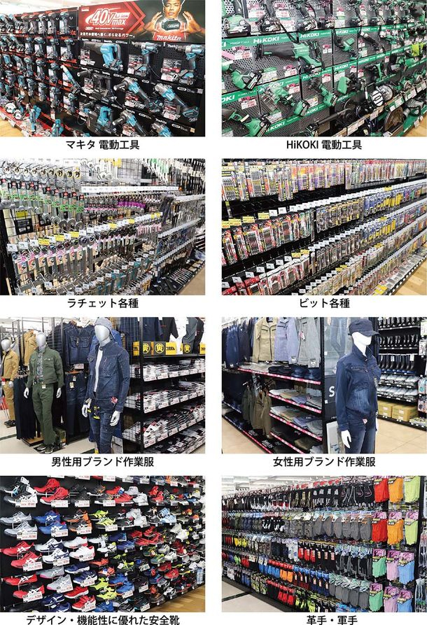 高機能・ハイスペックな商品も豊富に揃える。現物を手に取って使い勝手やフィット感を比べることができるというリアル店舗の強みを打ち出す。電動工具は500品目、ラチェットは100品目、ビット類は550品目、工具全体では1万3000品目を在庫する。また、ブランド作業服は1200品目、安全靴は200品目、革手・軍手類は650品目、作業服全体では3000品目の品揃えだ。