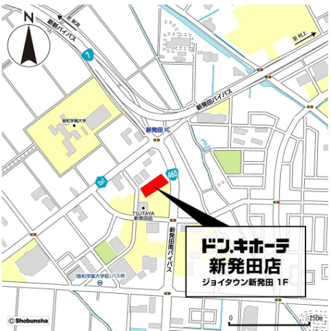 ドン・キホーテ新発田店は、国道460号新発田南バイパス沿い、新新バイパス新発田I.C交差点の近くに位置する「ジョイタウン新発田」の1階への出店だ。2階はボーリング場で、敷地内にはTSUTAYAと三宝茶楼が隣接している。また、周辺は飲食店や物販店などの商業施設が多く、大学や学校も近いので、幅広い客層が期待できる。